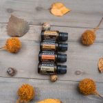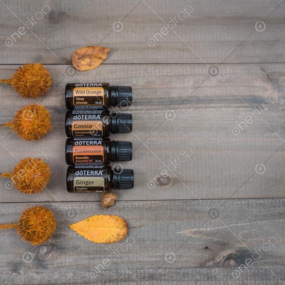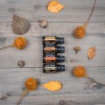 Fall Oils | dōTERRA Wild Orange, Cassia, dōTERRA Frankincense & Ginger on layflat wood with fall leaves - 3 Image Variations