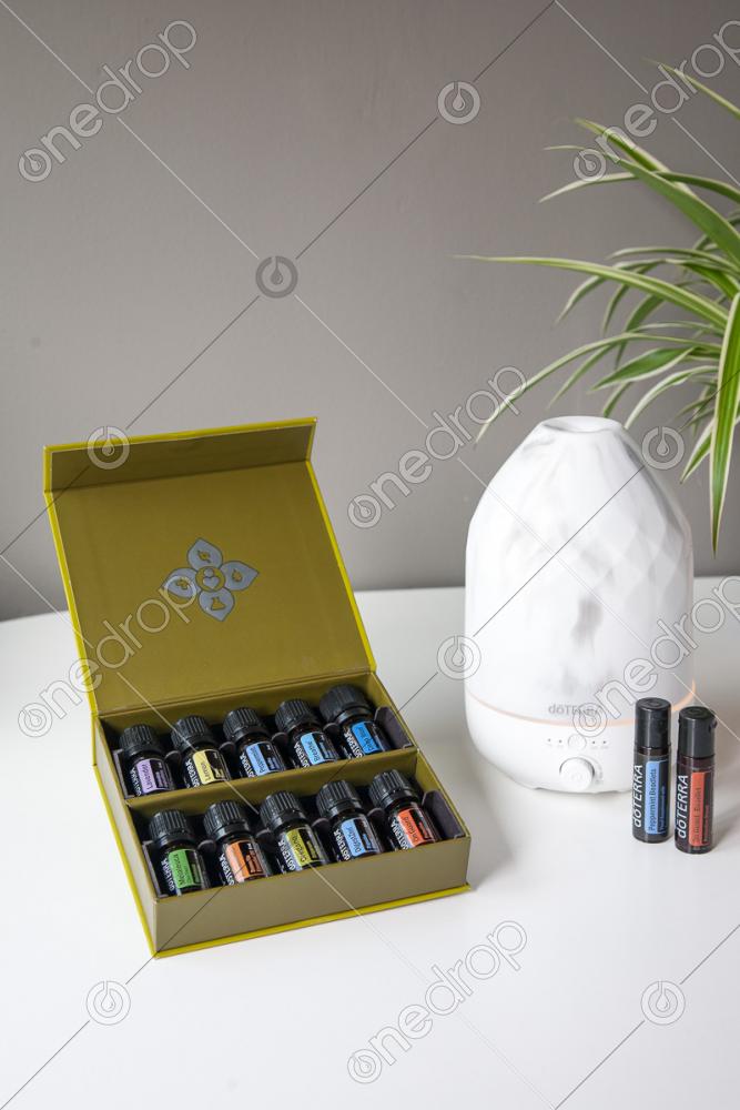 Family Essentials Kit with beadlets, Volo marble diffuser and plant in the background.