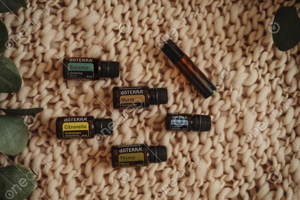 Warm, Earthy Styled Image of Fearless Roller Blend using Balance, Myrrh, Juniper Berry, Citronella and Thyme.