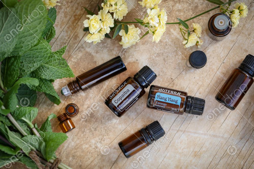 Flat lay image featuring dōTERRA Copaiba and Ylang Ylang