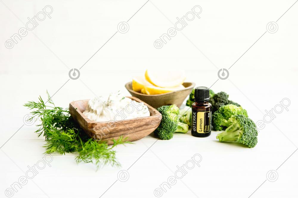Lifestyle high-resolution photograph of healthy lemon dill dip. Can be used with any recipe. Easy snack. Highlighting Lemon oil and Dill. Image can be cropped to your liking.