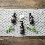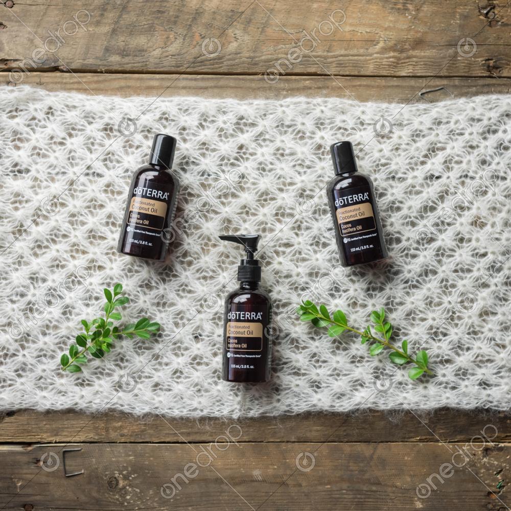 Fractionated Coconut Oil (FCO) layflat with greenery on weathered wood - 3 Image Variations
