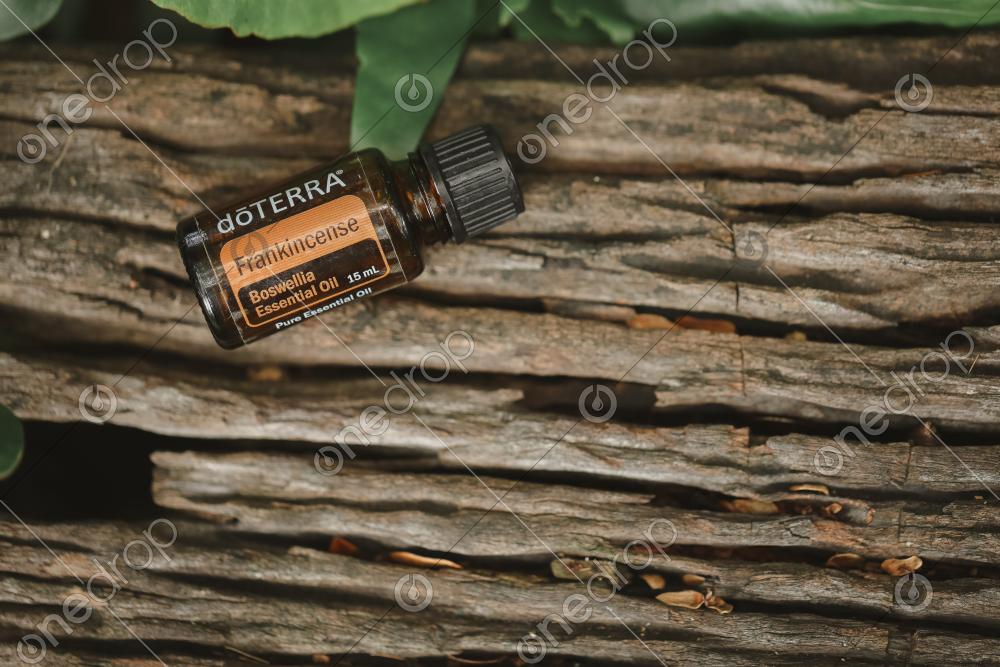 A high-res image of one of doTERRA's Top 10 oils, Frankincense (The King of Oils). This image contains a 15ml, full sized bottle on a natural wooden log with leafy greenery in the background.Image leaves plenty of room for copy and/or watermark.