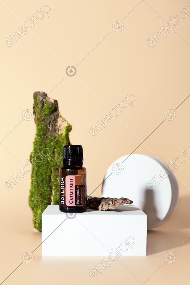 Geranium essential oil in bottle 15 ml on geometric podium