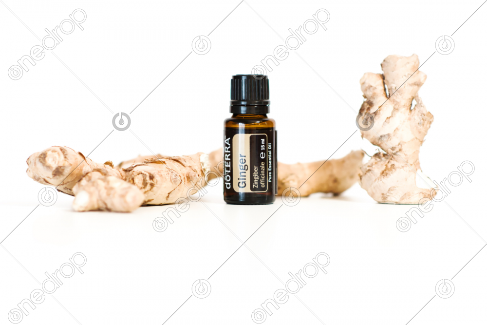 High-resolution image of Ginger 15mL oil bottle on a background of natural ginger