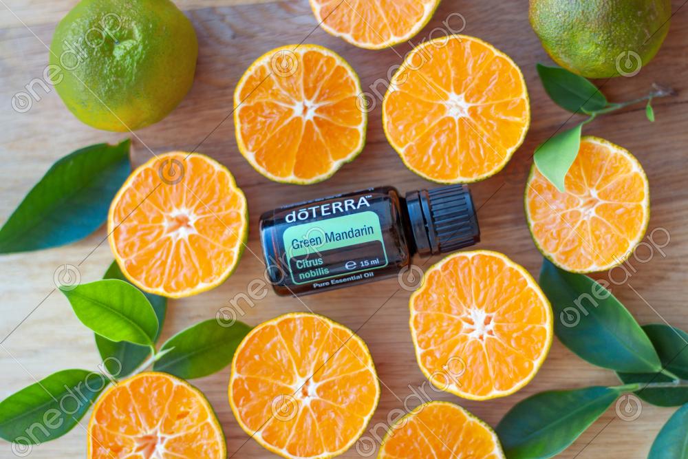 Horizontal photo of Green Mandarin oil with fruits and leaves on a wooden plate.