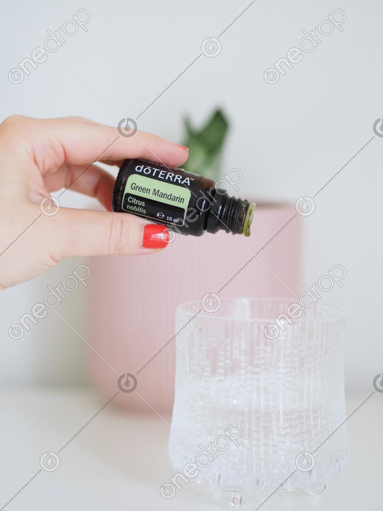 First one with a glass of water and second one on it's own with a green plant background. Perfect for your own copy, diffusers blend's and recipe. Suitable for promote natural lifestyle and Green Mandarin essential oil.