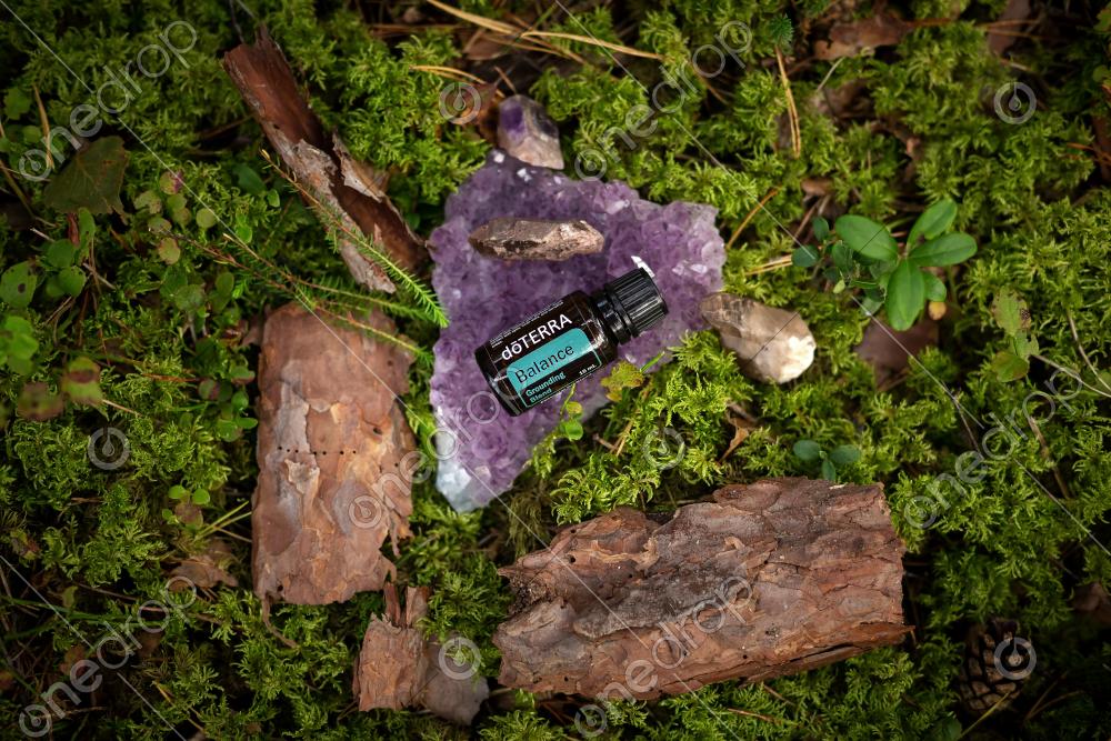 Grounding essential blend dōTERRA Balance in forest on natural green moss