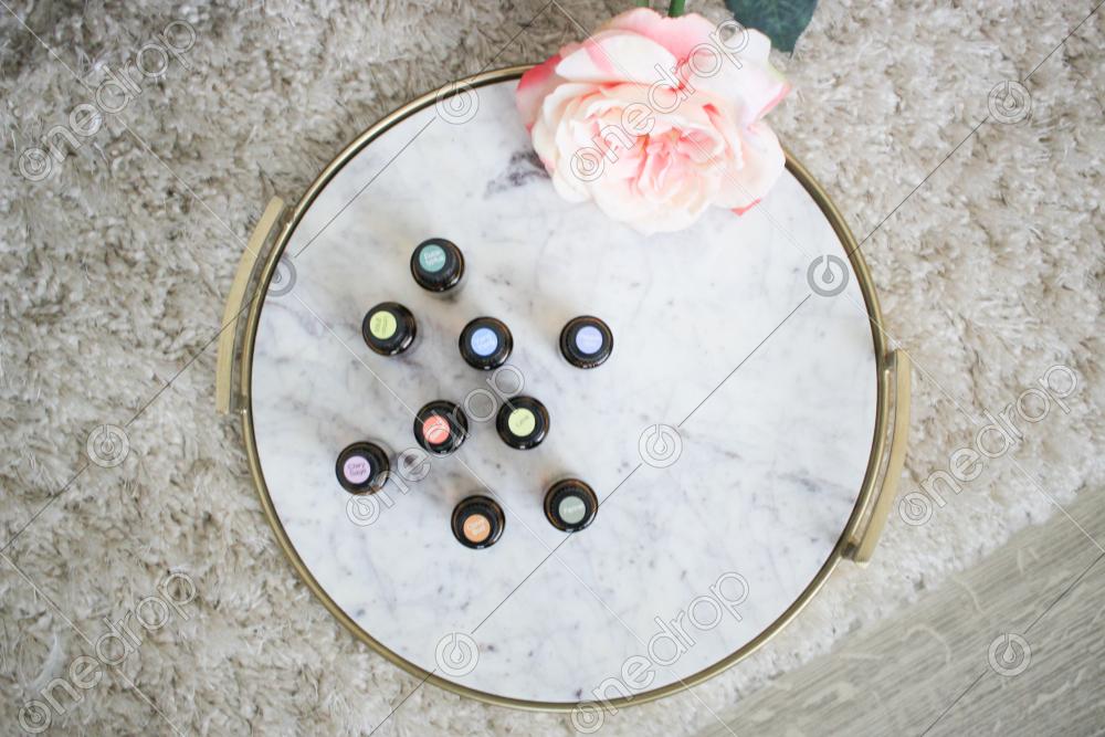 Group of Essential Oil Bottles on a Marble Tray with Pink Flowers