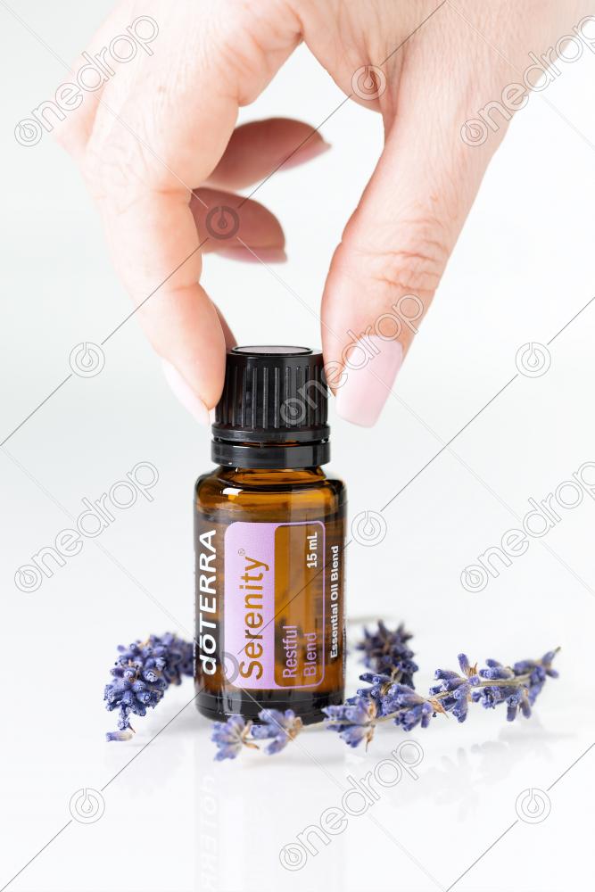 Hand Grabbing Bottle with essential blend dōTERRA Serenity on white