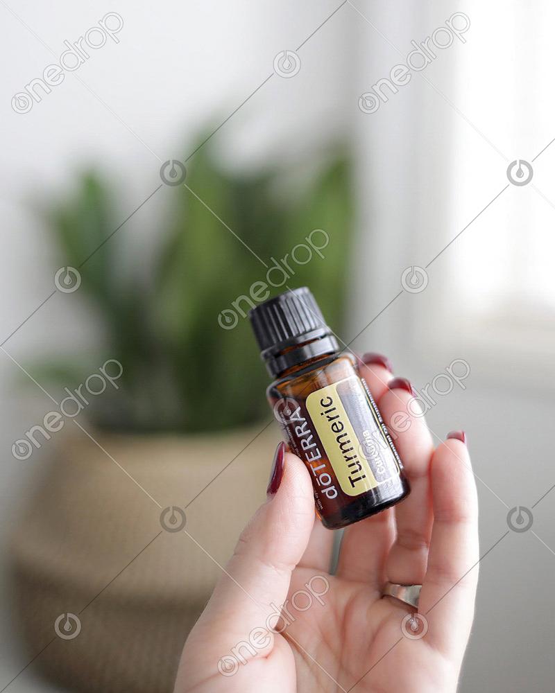 HAND HOLDING TURMERIC ESSENTIAL OIL