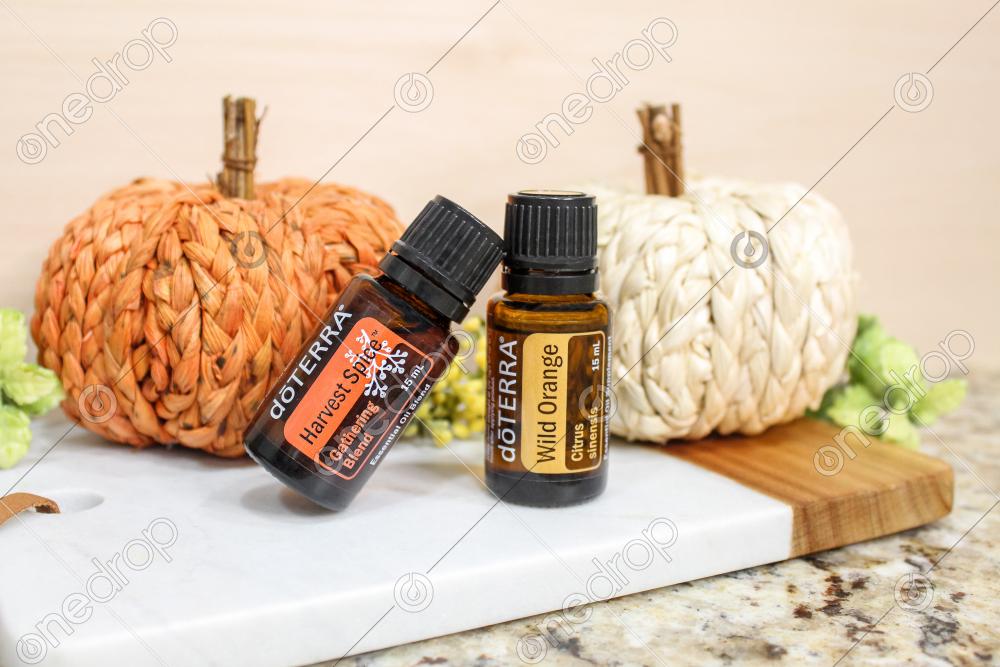 This high resolution image features doTERRA Harvest Spice® and Wild Orange on a wood/marble cutting board. Two woven pumpkins and greenery compliment the harvest theme!
