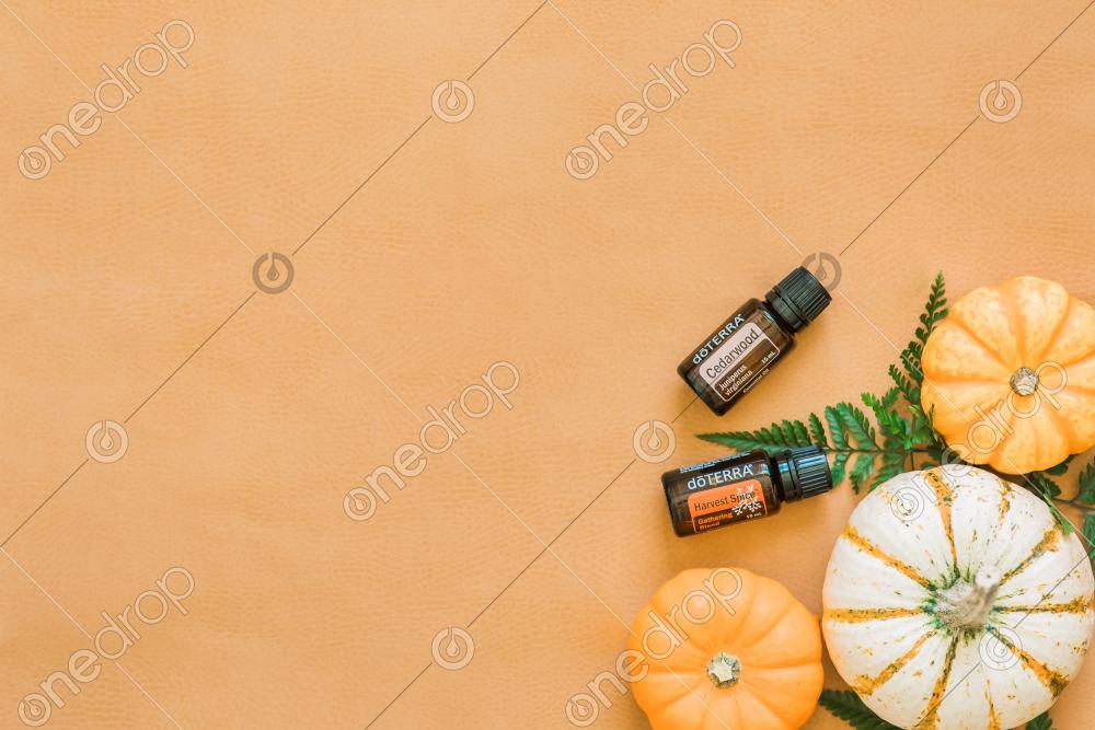 Harvest Spice® and Cedarwood essential oils on brown background with orange and white pumpkins and a green fern. Blank space can be used to add text or high resolution image can be cropped creatively for Instagram or social media.