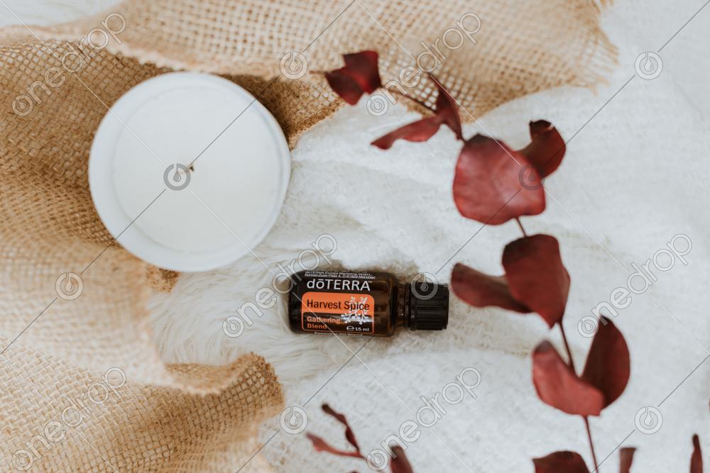 A cozy Harvest Spice flatlay with fabric and a candle