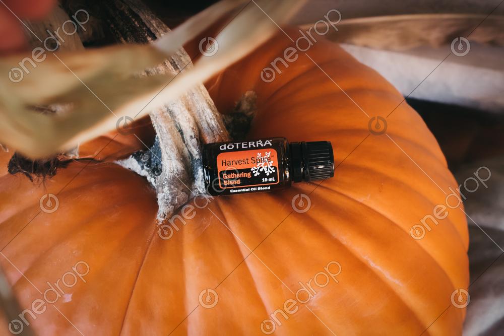 2 images featuring 15ml Harvest Spice gathering blend with pumpkins