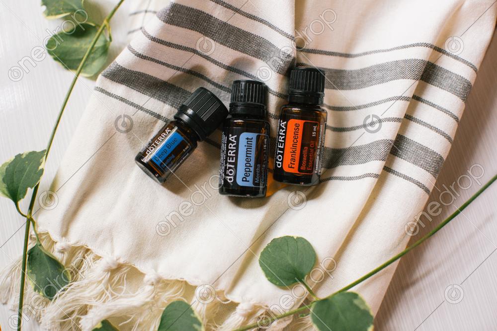 High-resolution photograph of Deep Blue, Frankincense, and Peppermint "Head Tension" roller bottle blend. Horizontal orientation with room for cropping and text if desired.