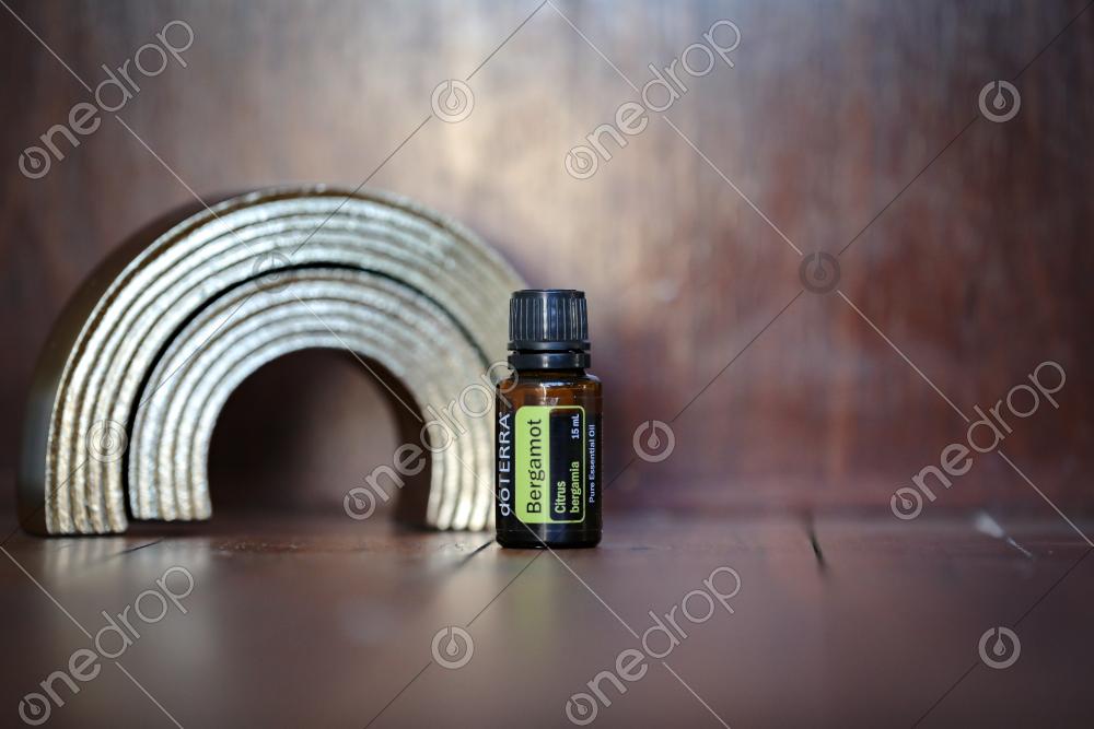 High resolution product image of Bergamot displayed on wood grain background with metallic rainbow