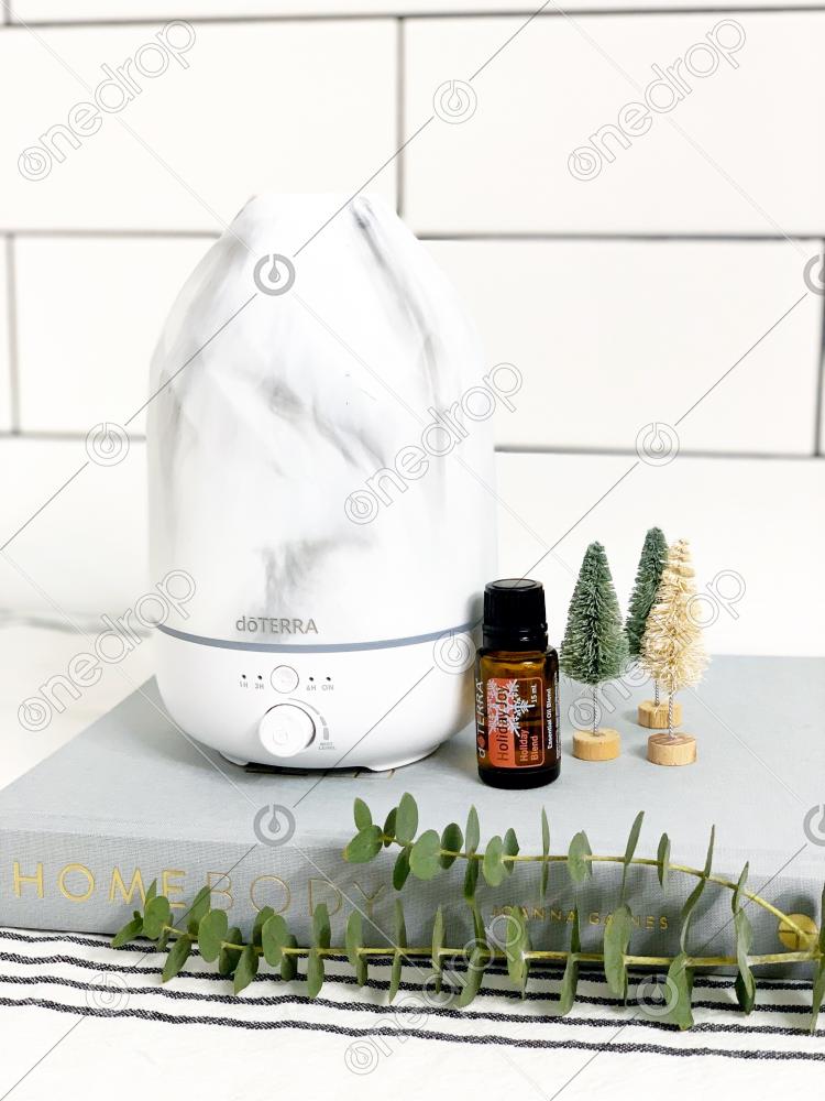 Featured: Holiday Joy - Holiday Blend & the Volo Diffuser in Marble. The first image features the book: Homebody by Joanna Gaines & little trees.