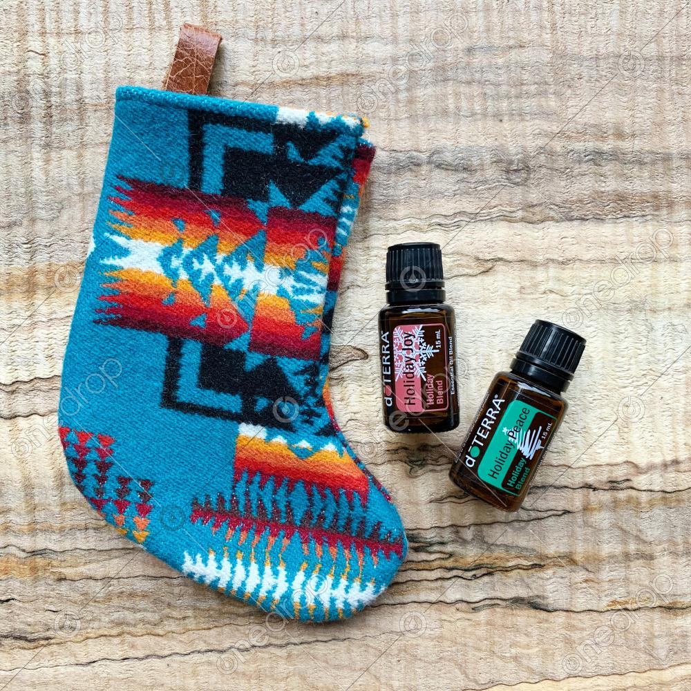 Features exclusive dōTERRA Holiday Oils. Holiday Joy & Holiday Peace on a natural wood background with a Mini Pendleton Stocking.