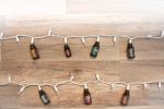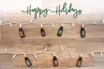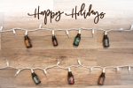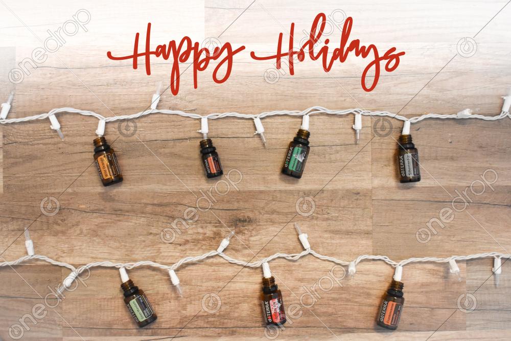 Wild Orange, Cinnamon Bark, Holiday Peace, Siberian Fir, Green Mandarin, Holiday Joy, and Frankincense on holiday light strand.