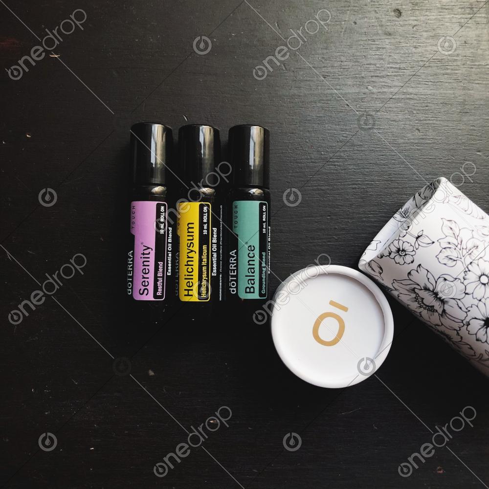 The three holiday touch rollers, balance, serenity and helichrysum on a dark background as a lay-flat image. Use for your social media posts. The image is square so it works for Instagram or Facebook.