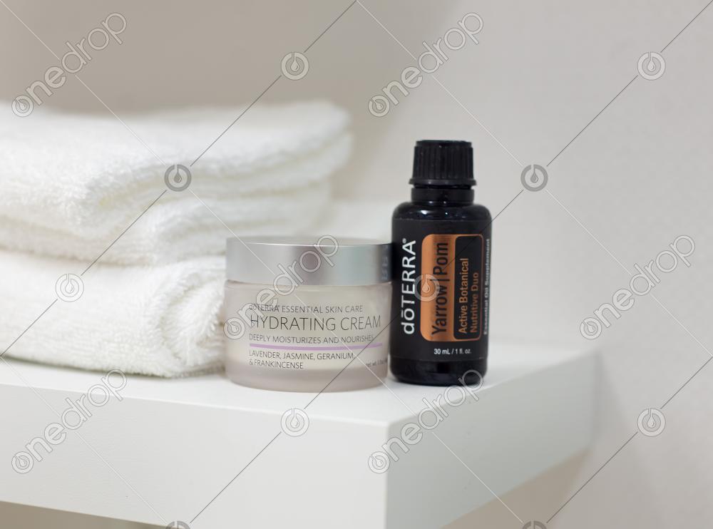 Hydrating Cream and Yarrow Pom on shelve with white towels