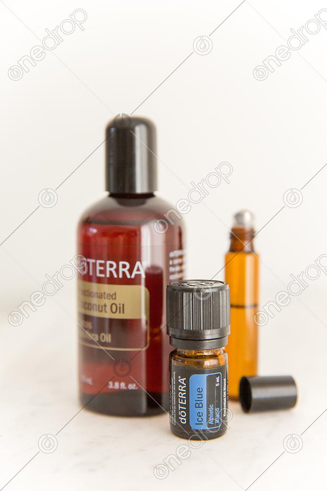 This image is of a 5ml bottle of Ice Blue, with a bottle of Fractionated Coconut Oil and an amber roller bottle.