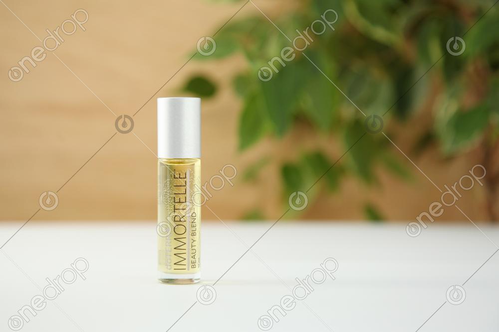 High-Resolution product photograph of Immortelle® 10ml roller bottle with a green leaf and wooden background.