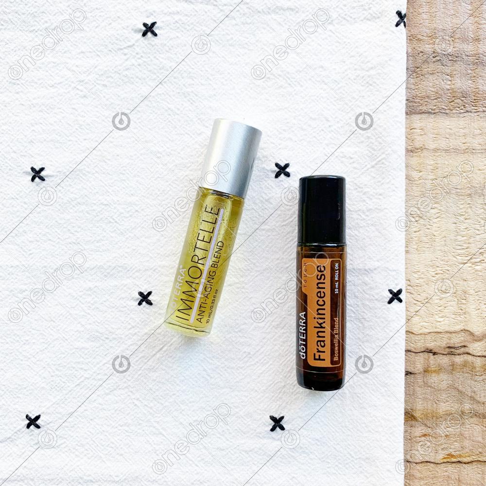 Features 10ml Immortelle (Anti-Aging Blend) Roller & 10ml Frankincense Touch Roller in a Flat Lay.