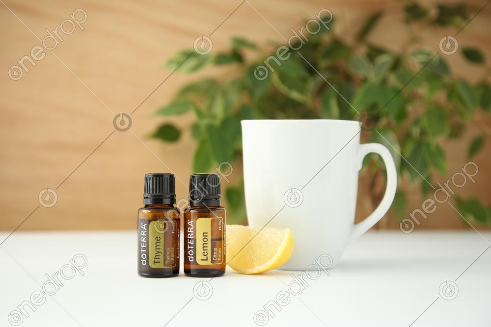 (Immunity) Lemon & Thyme 15ml Bottles with Green Leaf and Wooden Background