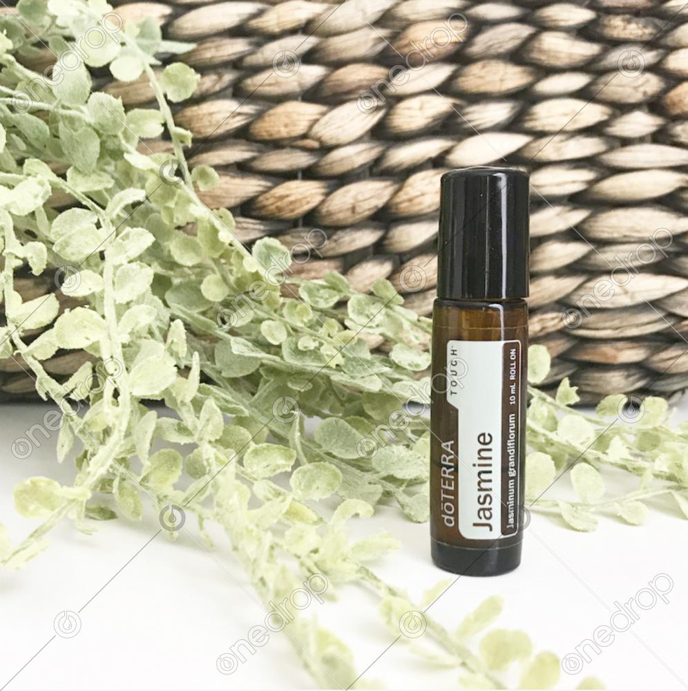 Jasmine roller with greenery & natural woven basket in the background.