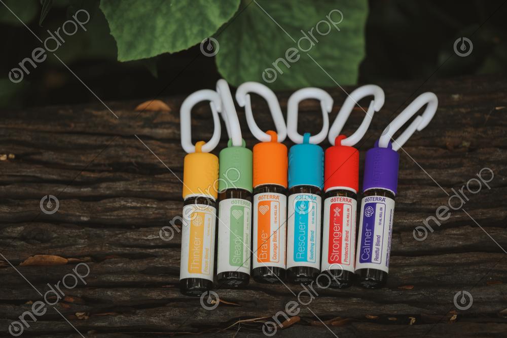 Kids Collection of 6 oils displayed in a row on log with natural surroundings.