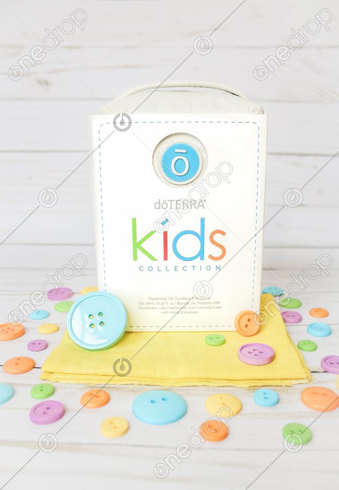 This high resolution image features doTERRA's Kids Collection™. The background is white wood with a fun sprinkle of color-coordinating buttons.