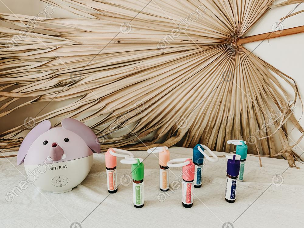 The whole kids collection roller bottles and carabiners with elephant diffuser set against a beautiful dried palm leaf