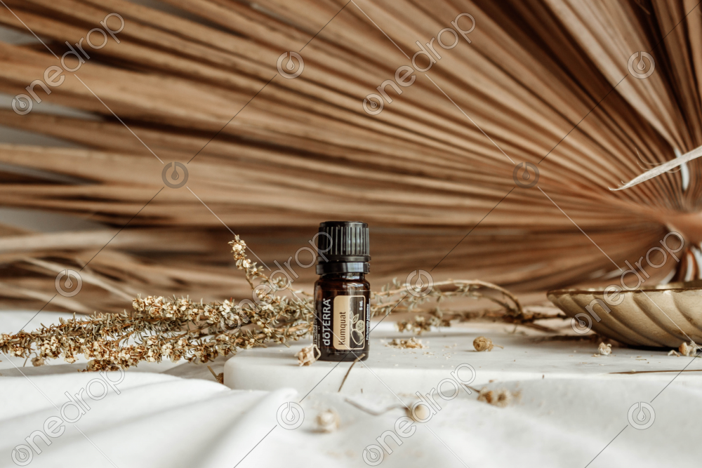 Photograph of the Kumquat 5ml standing on marble board with dried flowers and dried palm leaf. Natural, bright, warm.
