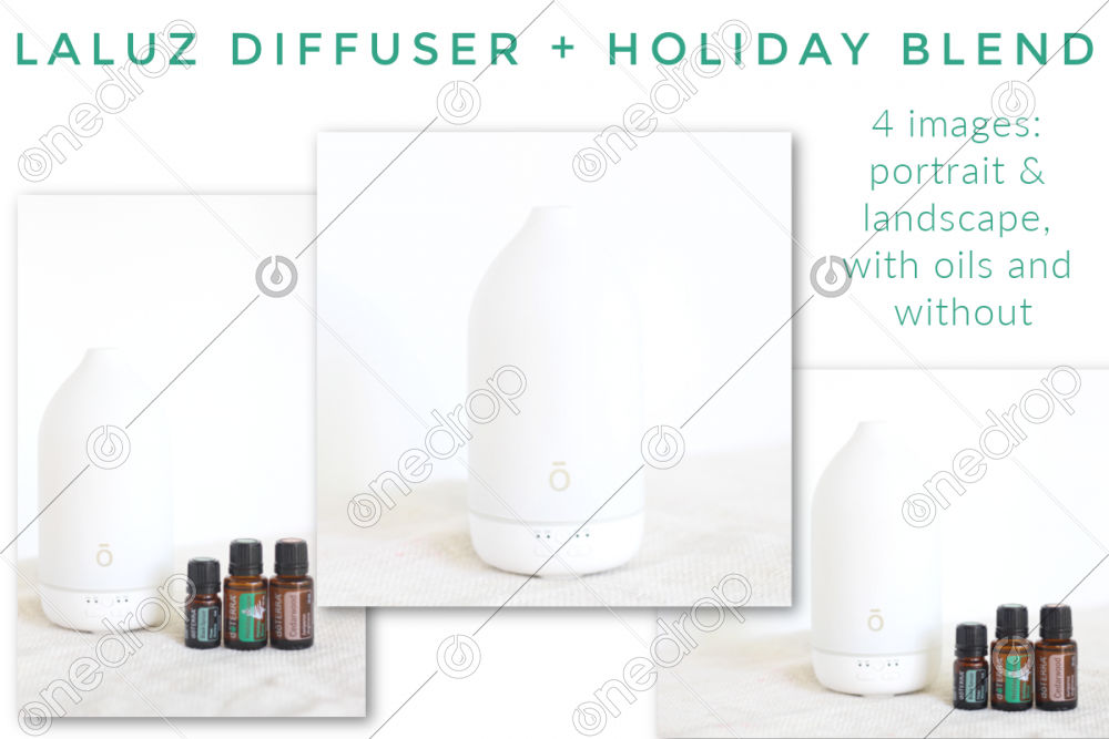 Real life photos of the Laluz diffuser, some images include oils for a nice holiday blend. Add your text on the images, if desired! Blank slate for you to work with or use as is.