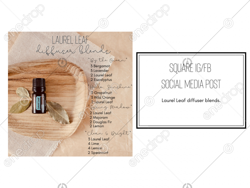 1 High resolution .png image of Laurel Leaf with diffuser blend recipes. Square image is ready for IG/FB and email posts.