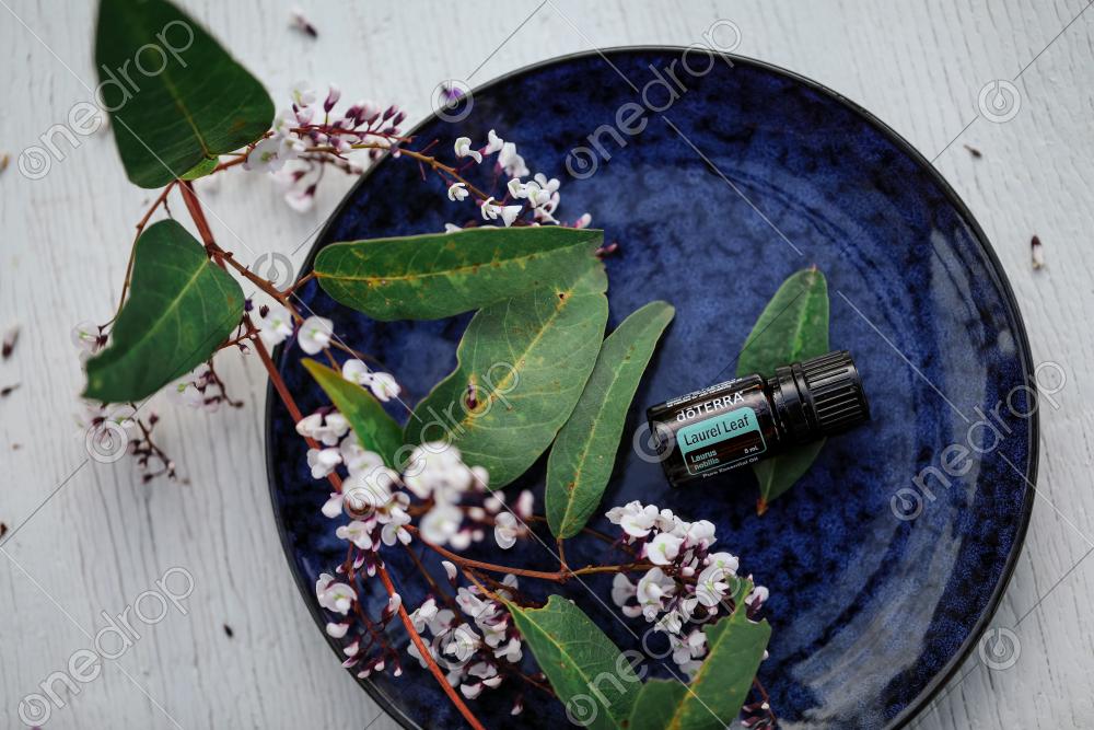 Laurel leaf on vibrant blue plate with fresh flowers