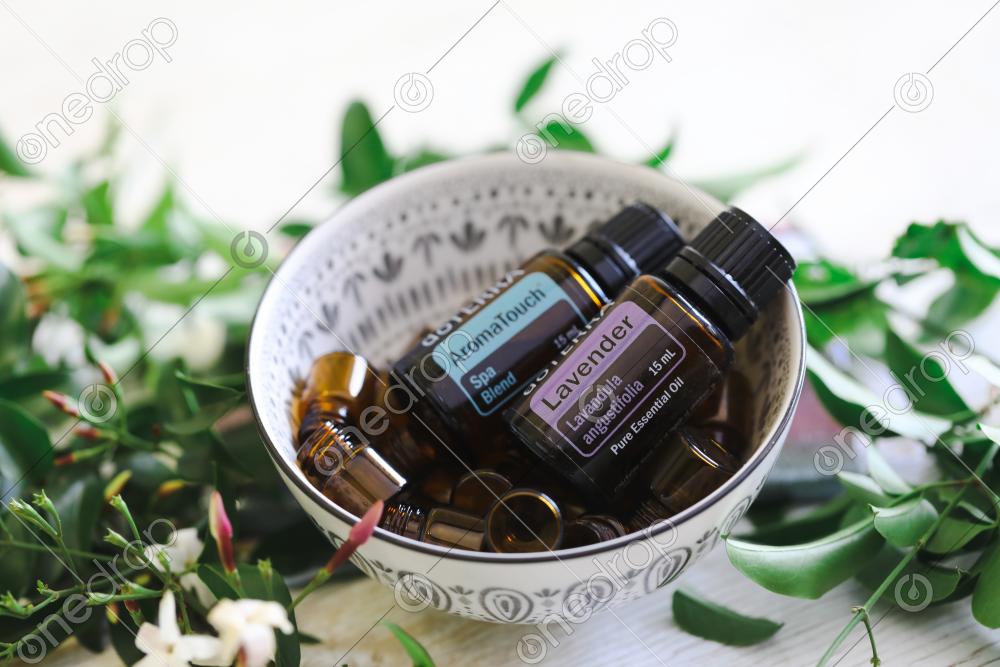 dōTERRA Lavender and AromaTouch in bowl with 1ml sample drams surrounded by fresh jasmine