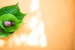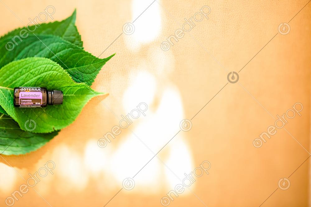 dōTERRA Lavender Essential Oil Bottle on Brown Leather Background with Leaves and Natural Light
