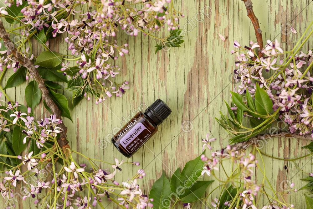 dōTERRA Lavender flat lay on wooden surface surrounded by purple flowers