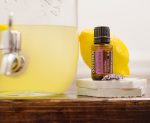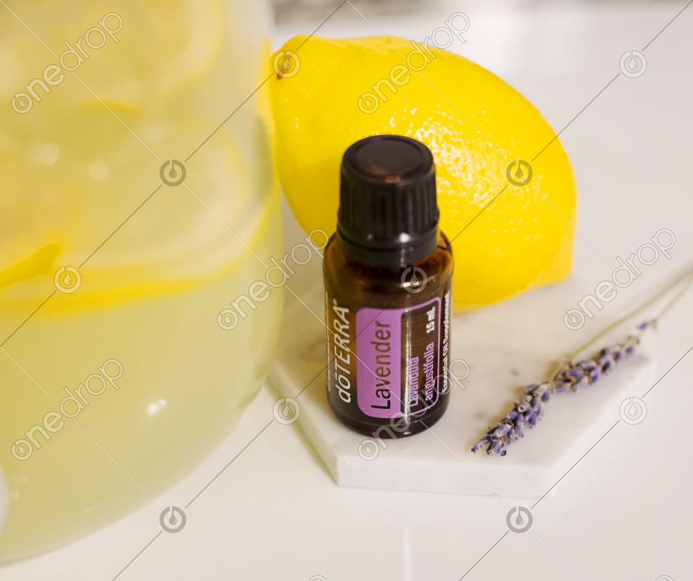 High resolution images of a Lavender bottle beside lemonade with a lemon and lavender sprouts.