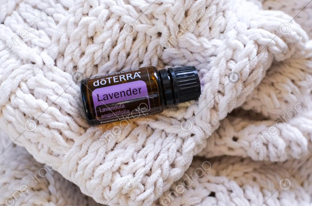 Lavender Essential Oil on Blanket. Simple and Clean product photo.