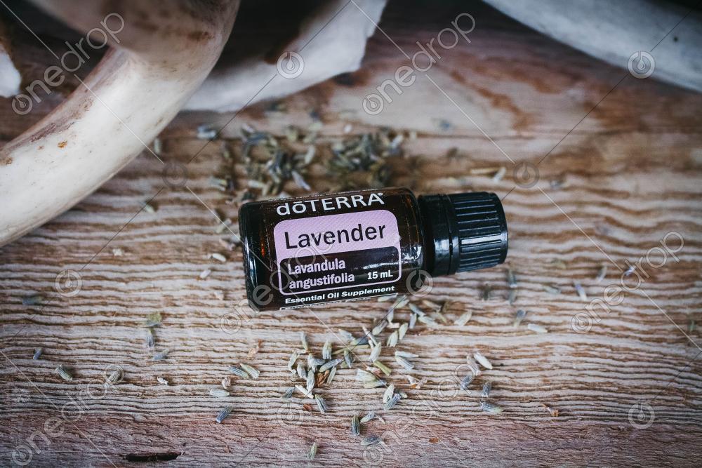 This photo features a 15 ml bottle of Lavender on wood with dried lavender and deer antlers