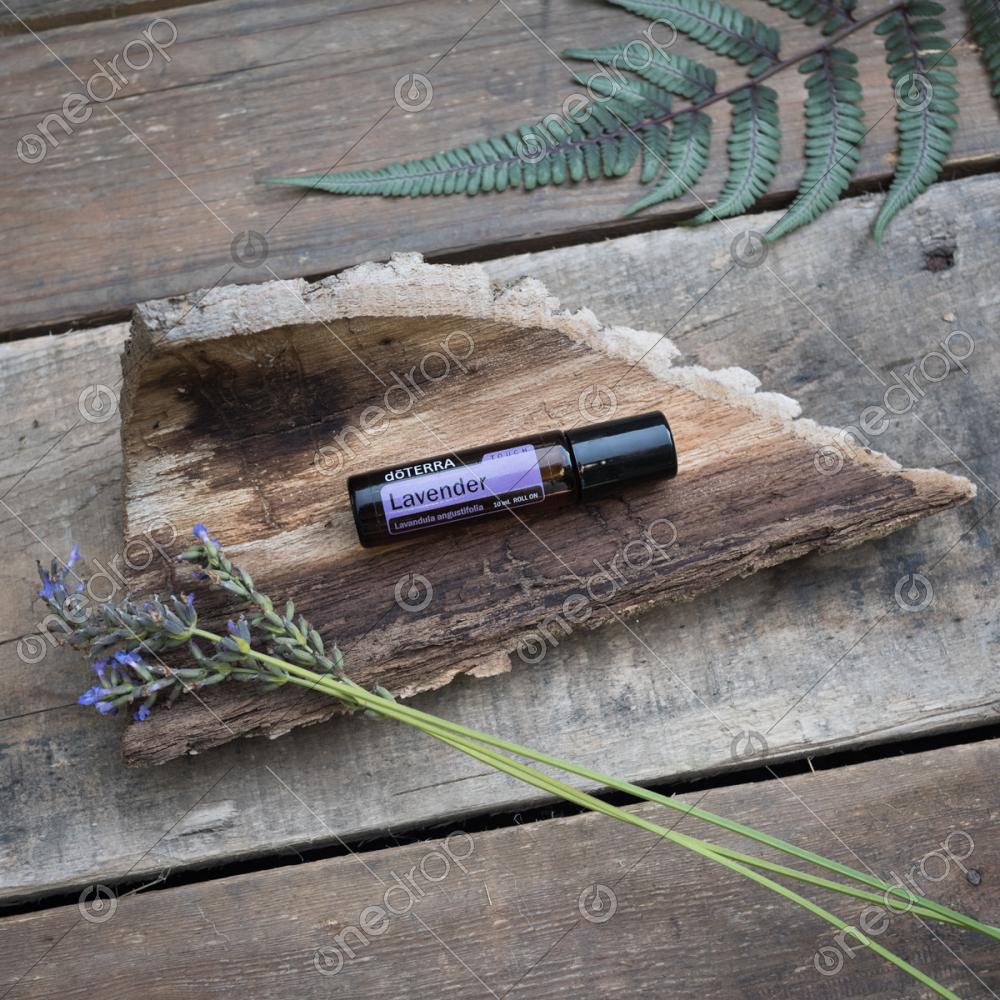 dōTERRA Lavender Touch - flay lat on rustic wood with greenery