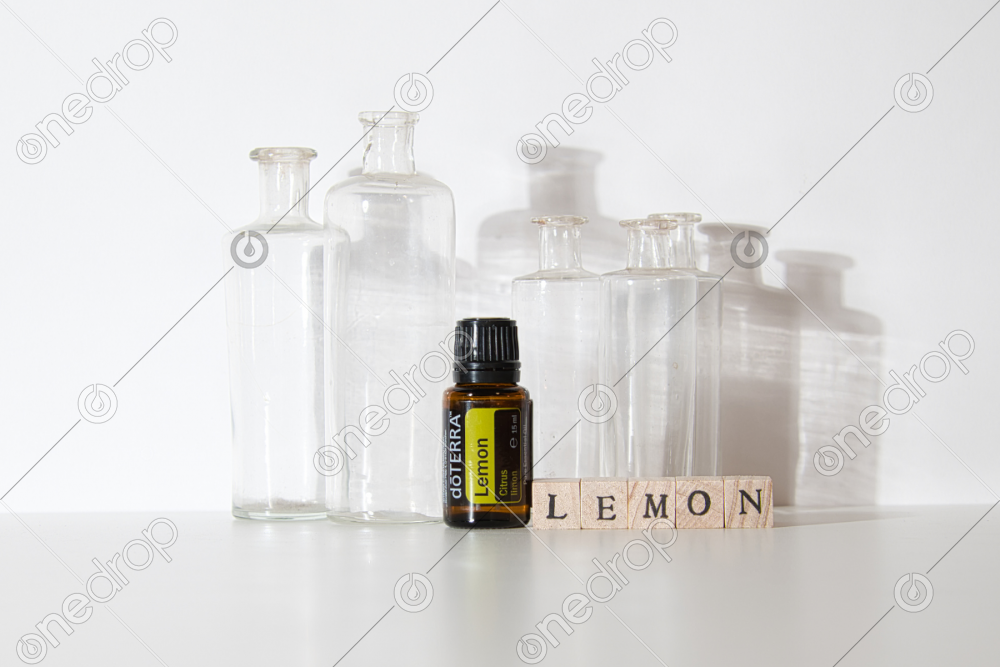 High-resolution image of Lemon 15 mL oil bottle on a white background and glass bottles