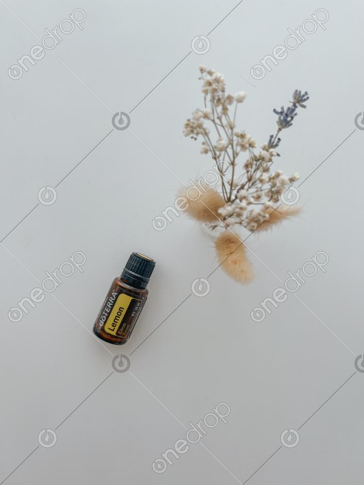 15 ml Lemon oil on a white table with a small vase with flowers.