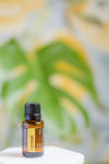 Lemon Essential Oil 15 ml on bright background with yellow flowers and leaves. Blank space can be used to add text or high resolution image can be cropped creatively for Instagram, Facebook, or social media.