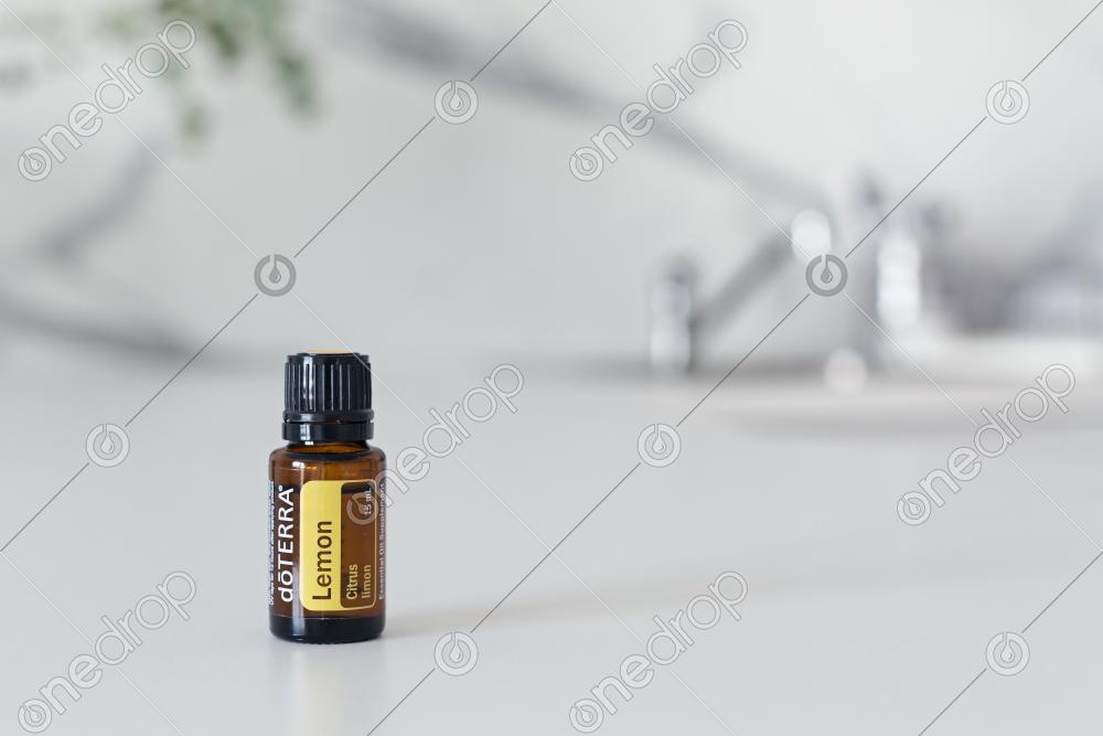 Essential oil of Lemon in 15ml bottle on white kitchen interior background