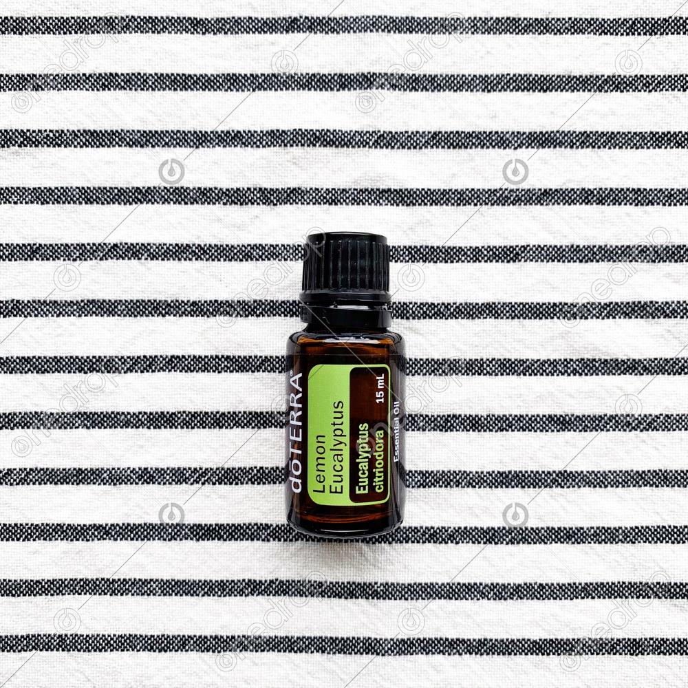 Lemon Eucalyptus, Citronella, Celery Seed, & Black Spruce on a Striped Background.